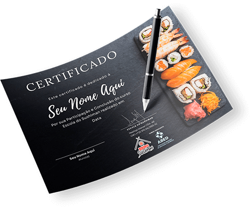 Ao dominar cada módulo, cada técnica, cada segredo do nosso curso, você não apenas solidifica seu nome no mundo do sushi, mas também ganha um passaporte para o reconhecimento universal: o nosso certificado.